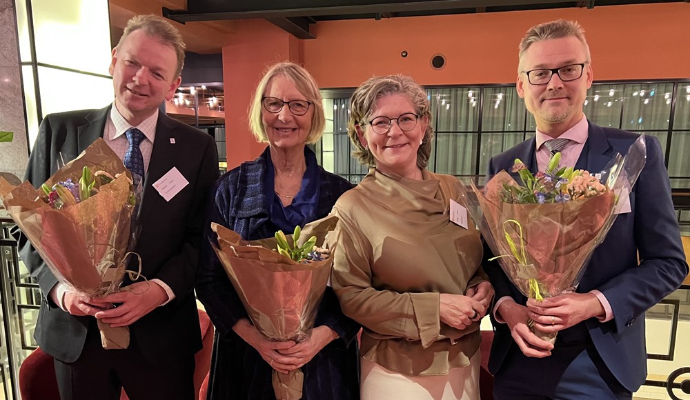 Från vänster Mattias Lantz, mottagare av SKS Opinionsstipendium, Kerstin Dahlgren, mottagare av SKS Hederspris för två år sedan, Ulrika Wretås, SKS ordförande, och Carl Berglöf, mottagare av årets SKS Hederspris.
